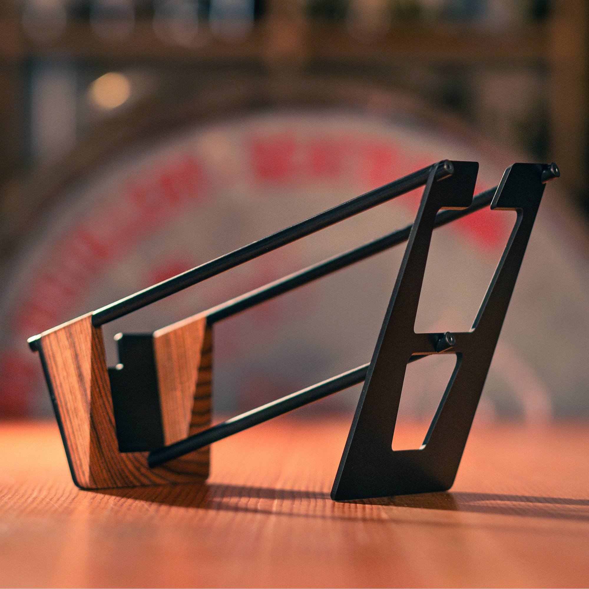 Presenting a bottle of wine to a guest lends an emotional opportunity for anticipation. Rather than overpowering, the cradle is intended to be a secondary recognition, complimenting first the focus of the label. Developing a carrying method without an obstructing handle over top was the gateway to this success. Reducing weight as much as possible ultimately led to a minimalist approach, nearly perceiving the bottle to be floating in the air.